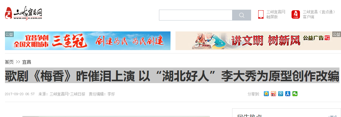 夷陵区委常委、宣传部部长黄光学在演出致辞时说,为大力弘扬社会主义核心价值观,积极倡导崇德向善、见贤思齐的良好社会风尚,充分发挥道德模范的榜样作用,夷陵区以湖北省道德模范、“大爱慈母”——李大秀为原型,精心打造了原创民族歌剧《梅香》,引发了社会各界的广泛赞誉,该剧目被纳入省、市文艺精品项目,是近年来夷陵精神文明建设的重要成果,是夷陵文化的集中展示,也是夷陵区首次用民族歌剧这种艺术形式呈现,为宜昌人民奉献的一台弘扬主旋律、传播正能量的精神文化大餐。