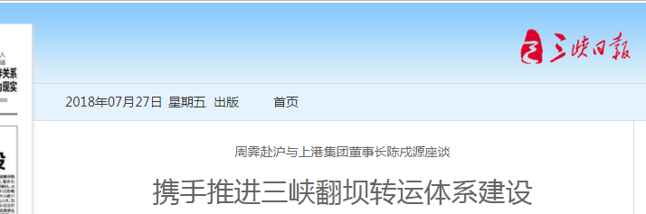 7月24日,市委书记周霁赴上海洋山港考察,并与上港集团董事长陈戌源座谈,深度对接合作事宜。双方表示,将从港口功能、物流、运营一体化入手,携手推进三峡翻坝转运体系建设,共同为长江经济带发展作贡献。