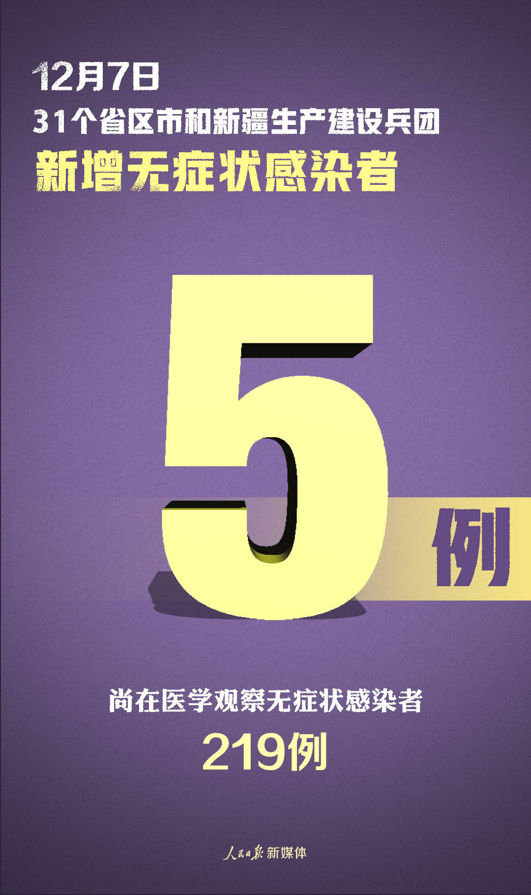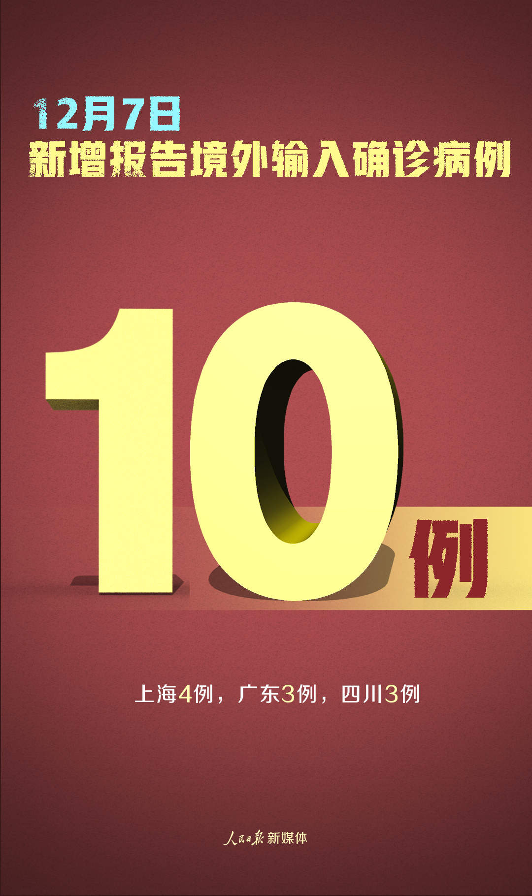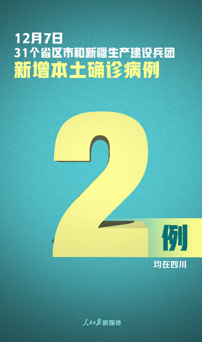 12月7日0—24时,31个省(自治区、直辖市)和新疆生产建设兵团报告新增确诊病例12例,其中境外输入病例10例(上海4例,广东3例,四川3例),本土病例2例(均在四川);无新增死亡病例;新增疑似病例1例,为境外输入病例(在上海)。