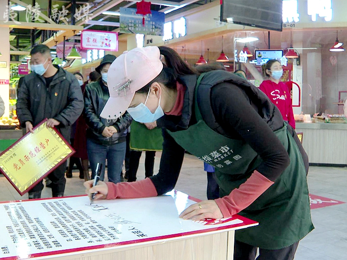 活动现场,际维菜市为5家诚信经营户和2家党员示范经营户授牌;全部商户在诚信经营承诺书上签字承诺:如若发现市场有缺斤少两现象,将给予消费者10倍的赔偿。