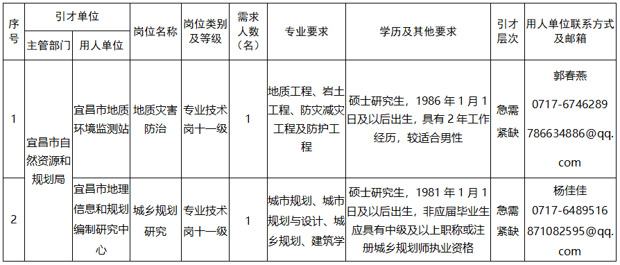 本次引进急需紧缺人才2名,涉及2个单位,2个岗位。