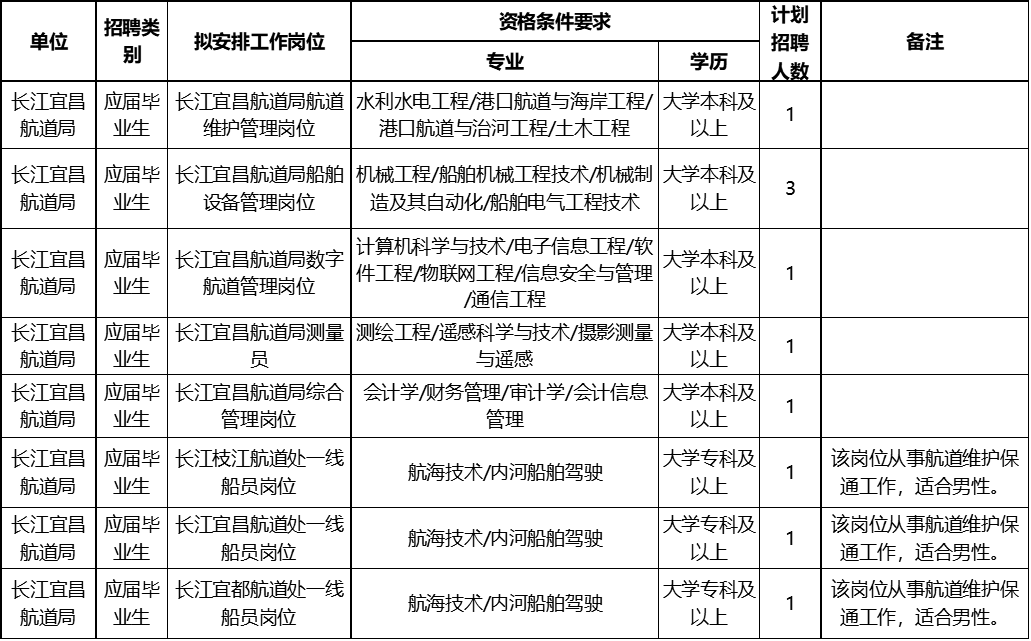 长江航道局发布2021年度招聘计划的单位包括:长江宜昌航道局、长江武汉航道局、长江航道测量中心3个单位,拟招聘事业编制人员44人。
