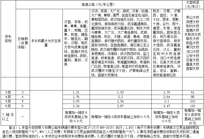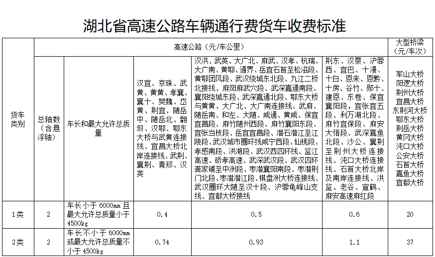 2021年1月25日,湖北发布最新高速公路车辆通行费货车、客车收费标准,详情如下: