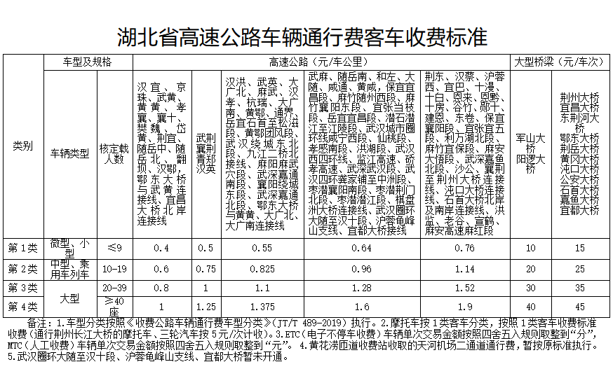 湖北最新高速公路收费标准