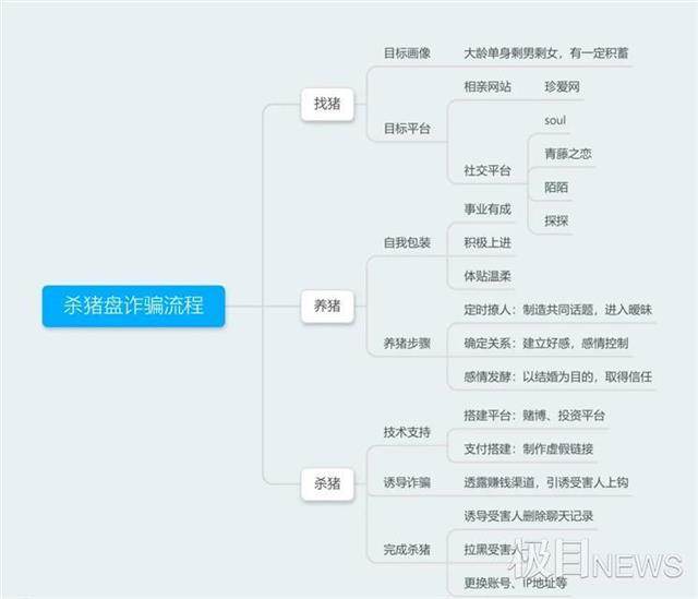 “杀猪盘”主要是指通过婚恋平台、社交软件等方式寻找潜在受害者,通过聊天发展感情取得信任,然后将受害者引入博彩、理财等诈骗平台进行充值,骗取受害者钱财的骗局。请看“杀猪盘”流程图。