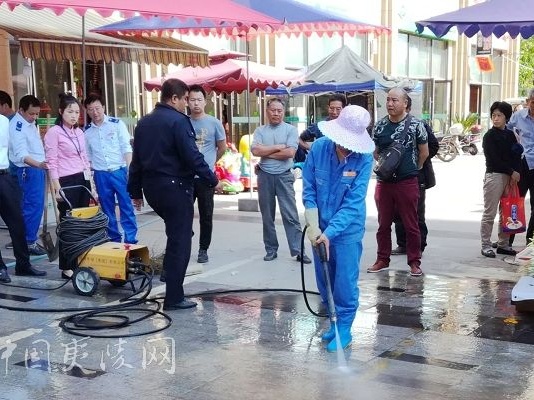 “重”清洗。出动8名作业人员和1台冲洗车、1台洗扫车采用先冲洗、后洗扫的方式,对绿环市场地面上的油污、泥垢进行了彻底清洗。