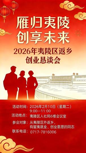- @夷陵区返乡群体,夷陵区2026年返乡创业座谈会邀请您来叙乡情、聊未来、谋大业
